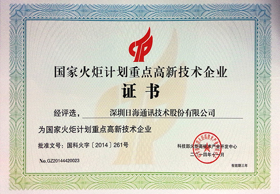 2012年3月25日,公司全资子公司深圳市海生机房技术有限公司被认定为“国家级高新技术企业”称号。